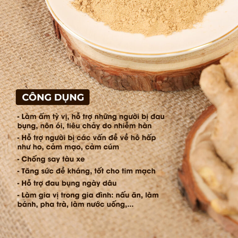 Công dụng: Làm ấm tỳ vị, chữa đau bụng, nôn ói, tiêu chảy do hàn; Hỗ trợ điều trị huyết áp thấp; Chống say tàu xe; Giảm đau bụng ngày dâu; Giảm ho, điều trị các bệnh về hô hấp; Dùng làm gia vị trong gia đình.