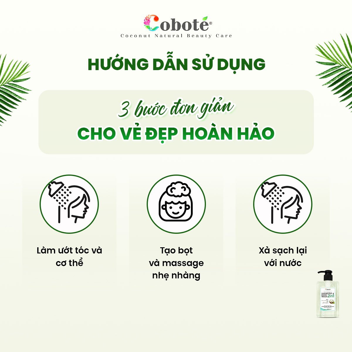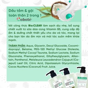 Dầu tắm gội toàn thân 2 trong 1 Coboté với công thức Bio:CLEAR làm sạch dịu nhẹ, bổ sung chiết xuất từ sữa dừa cùng Vitamin B5, cung cấp độ ẩm & dưỡng chất thiết yếu cho da và tóc, mang lại cho bạn làn da ẩm mịn và mái tóc suôn mềm khỏe mạnh