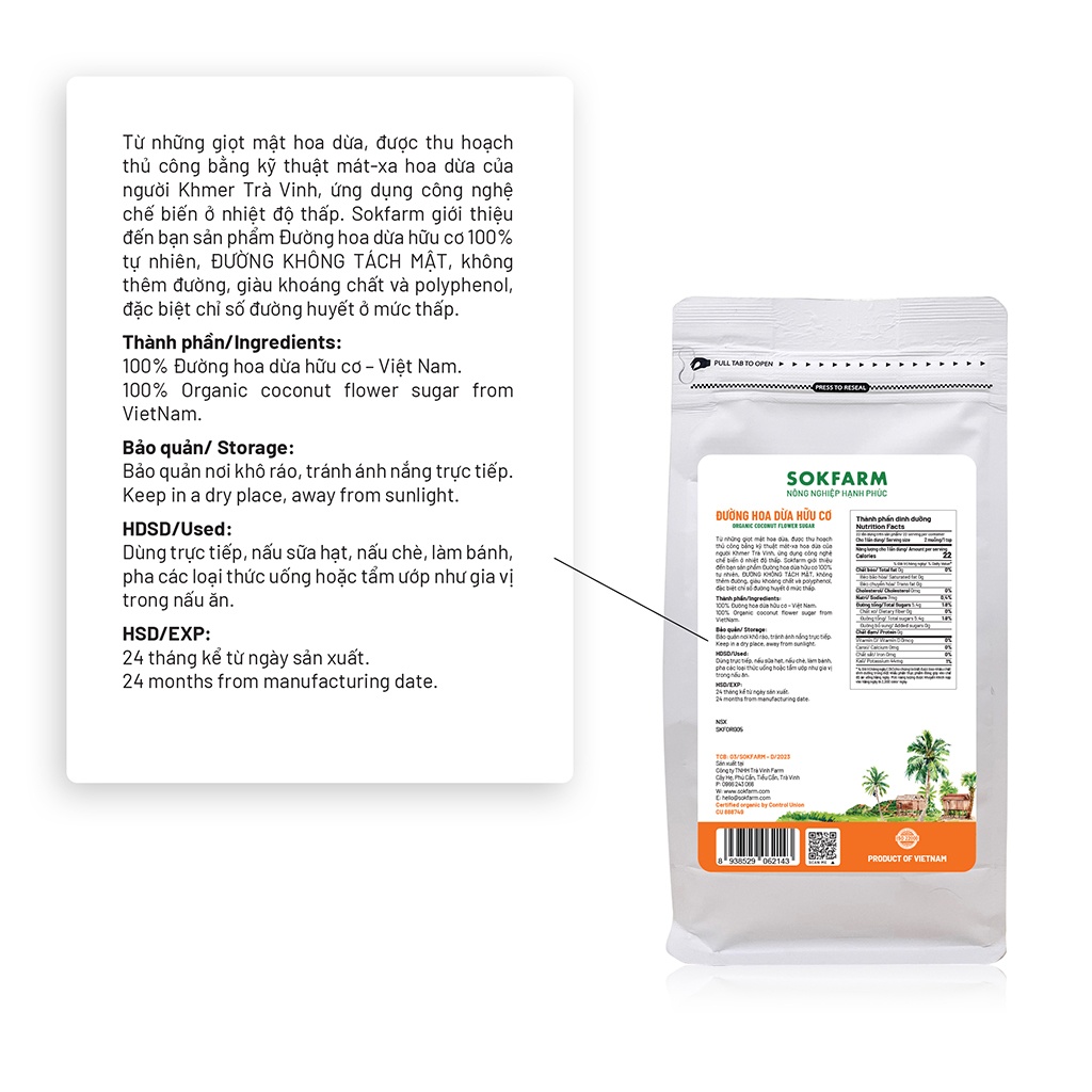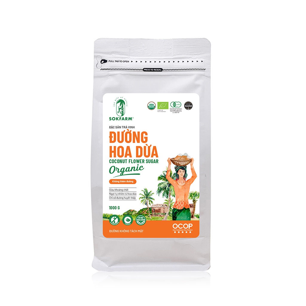 Đường hoa dừa hữu cơ Sokfarm là vị ngọt mới từ hoa dừa. Sản phẩm được thu thủ công bằng kỹ thuật mát-xa hoa dừa và thu mật truyền thống của người Khmer Trà Vinh và ứng dụng công nghệ chế biến ở nhiệt độ thấp. Đường hoa dừa nguyên chất 100%, giàu dinh dưỡng và khoáng chất tự nhiên, đặc biệt đây là đường hấp thu chậm tốt cho sức khỏe, cả gia đình an tâm sử dụng.