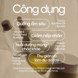 – Dưỡng ẩm sâu: Thành phần dầu dừa (Cocos Nucifera Oil), Glycerin và Sodium Hyaluronate giúp cấp ẩm, duy trì độ mềm mại cho da tay, ngăn ngừa khô ráp.