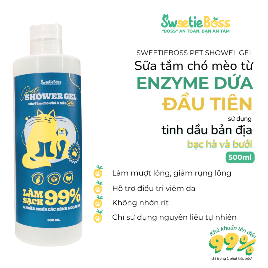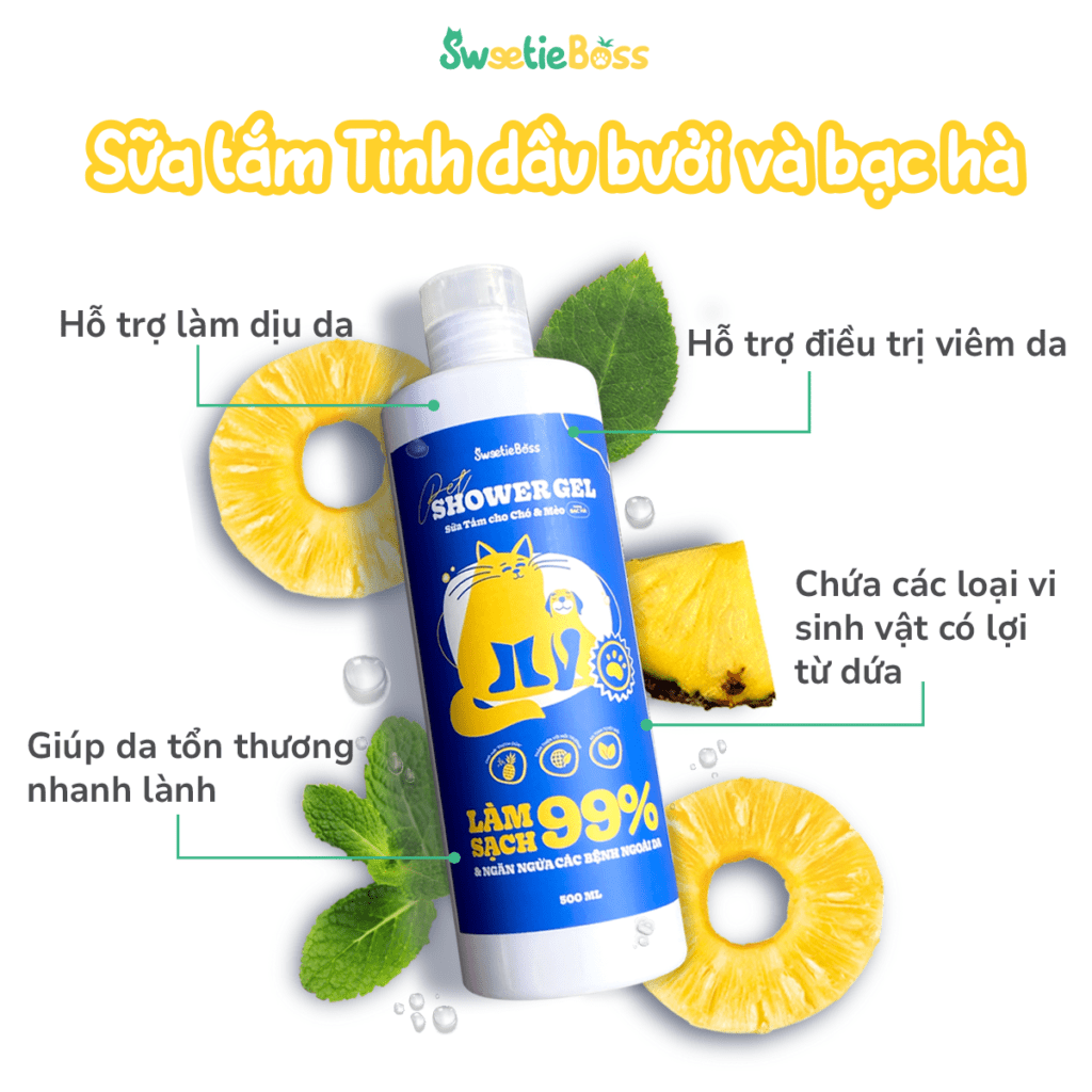 Sữa tắm chó mèo mượt lông SweetieBoss từ Enzyme Dứa thiên nhiên là sản phẩm chăm sóc thú cưng hoàn toàn tự nhiên và an toàn. Với thành phần từ Enzyme Dứa tự nhiên, sản phẩm giúp loại bỏ các bệnh ngoài da, viêm da, và kích ứng cho thú cưng của bạn.