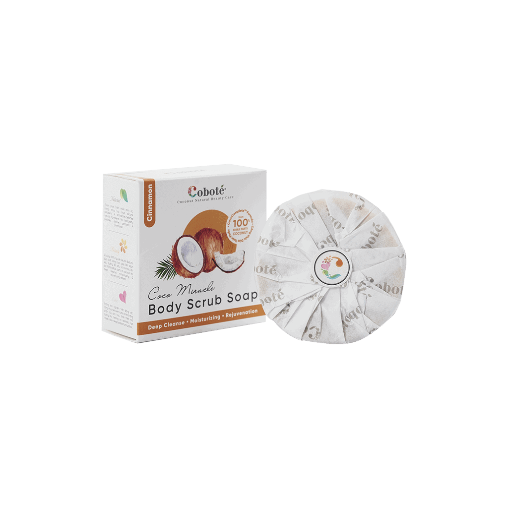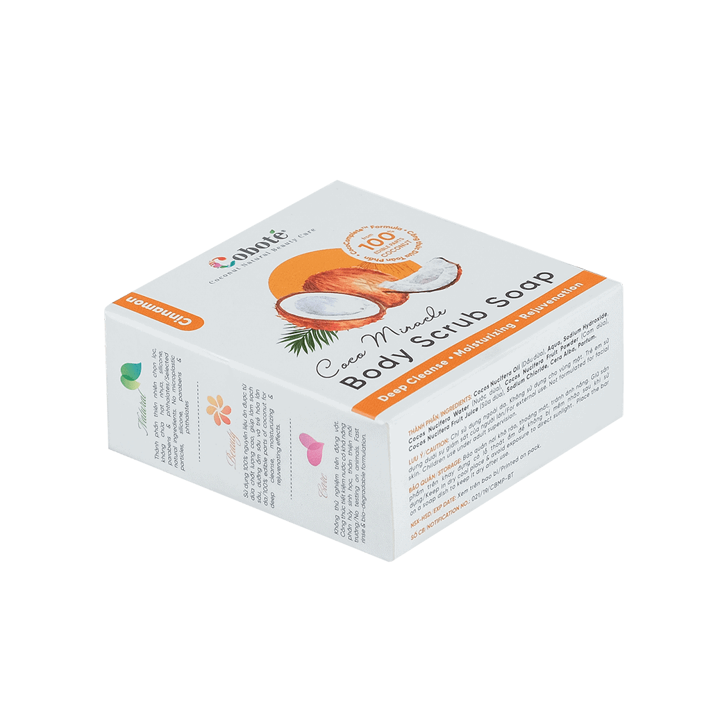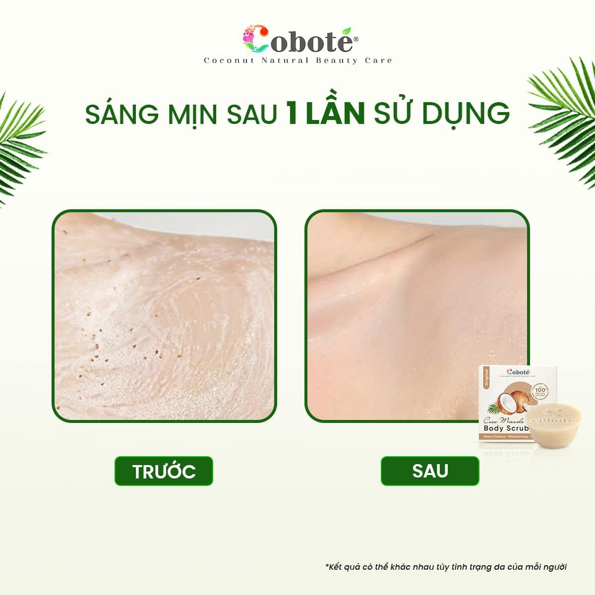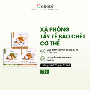 Coboté Handmade Coconut Body Scrub Soap – Xà bông tẩy tế bào chết Coboté được làm trong một quy trình khép kín. Công thức Dừa Toàn Phần CocoComplete™ sử dụng 100% nguyên liệu ăn được từ những trái dừa hảo hạng Bến Tre tạo ra một sản phẩm hoàn toàn tự nhiên và an toàn, giúp loại bỏ tế bào chết, thúc đẩy tuần hoàn máu dưới da và dưỡng ẩm hiệu quả, mang lại một vẻ đẹp tự nhiên và một làn da sáng mịn, đều màu, khỏe mạnh.