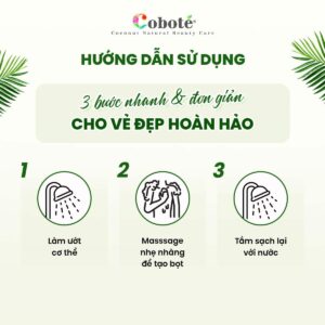 | Sử dụng & bảo quản | – Mát xa cơ thể với Xà bông tẩy tế bào chết Coboté mỗi ngày rồi tắm sạch lại với nước để đạt hiệu quả sạch sâu và dưỡng ẩm tốt nhất – Để xa tầm tay trẻ em. Trẻ em sử dụng dưới sự giám sát của người lớn vì bọt xà phòng có thể gây cay mắt. – Bảo quản nơi khô thoáng, tránh ánh sáng trực tiếp – Lưu ý sau khi tiếp xúc với nước, cần để lên khay chứa xà phòng có rãnh thoát hơi nước để sản phẩm không bị mềm nhão. |