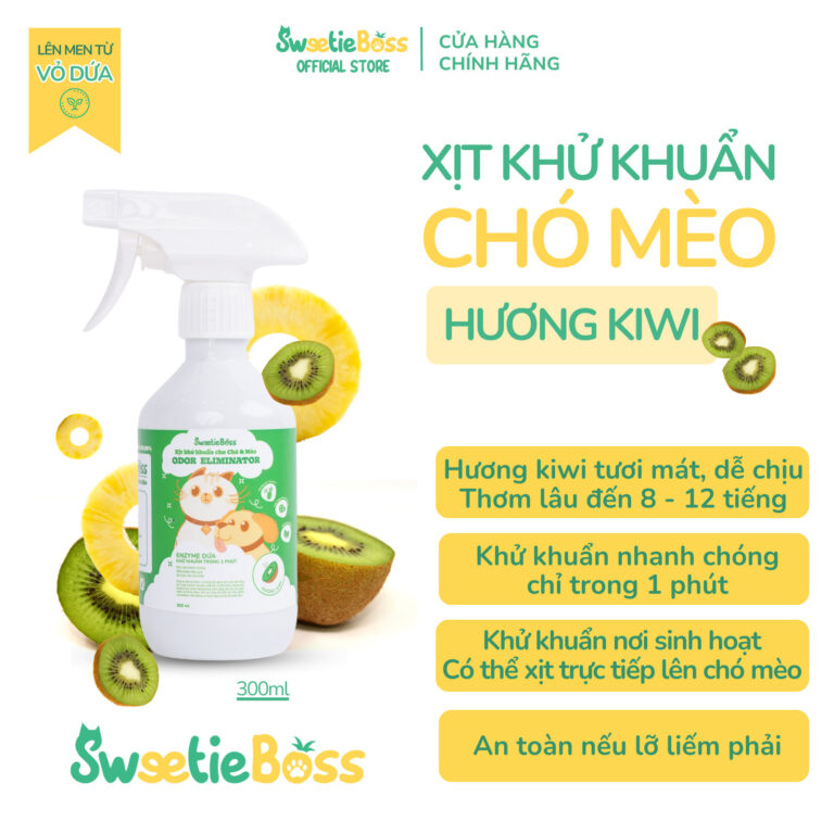 Xịt Khử Khuẩn SweetieBoss – Hương Kiwi là giải pháp tự nhiên giúp loại bỏ mùi hôi nước tiểu, mùi cơ địa chó mèo và diệt khuẩn hiệu quả. Sản phẩm được chiết xuất từ Enzyme Dứa kết hợp với hương Kiwi cao cấp, mang lại không gian sống thơm mát và sạch sẽ. Công thức an toàn tuyệt đối, phù hợp để sử dụng trực tiếp trên lông và da thú cưng.